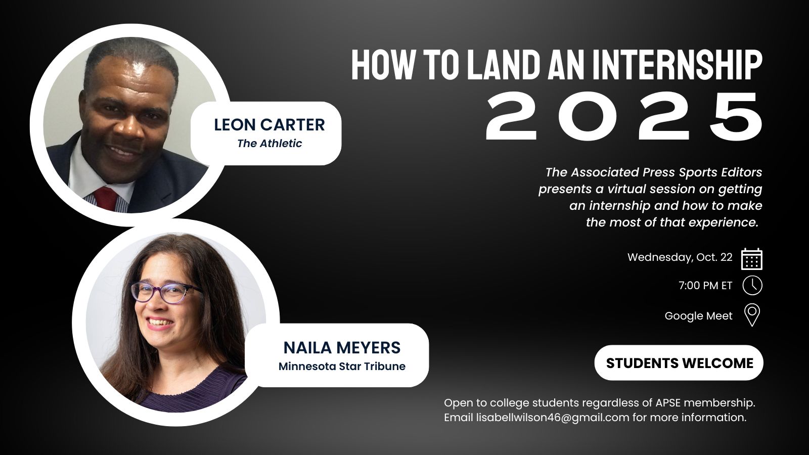 The Associated Press Sports Editors Career Advancement committee will host its annual How To Land An Internship virtual session at 7 p.m. ET/4 p.m. PT on Wednesday, Oct. 22. The session is open to college students regardless of APSE membership.